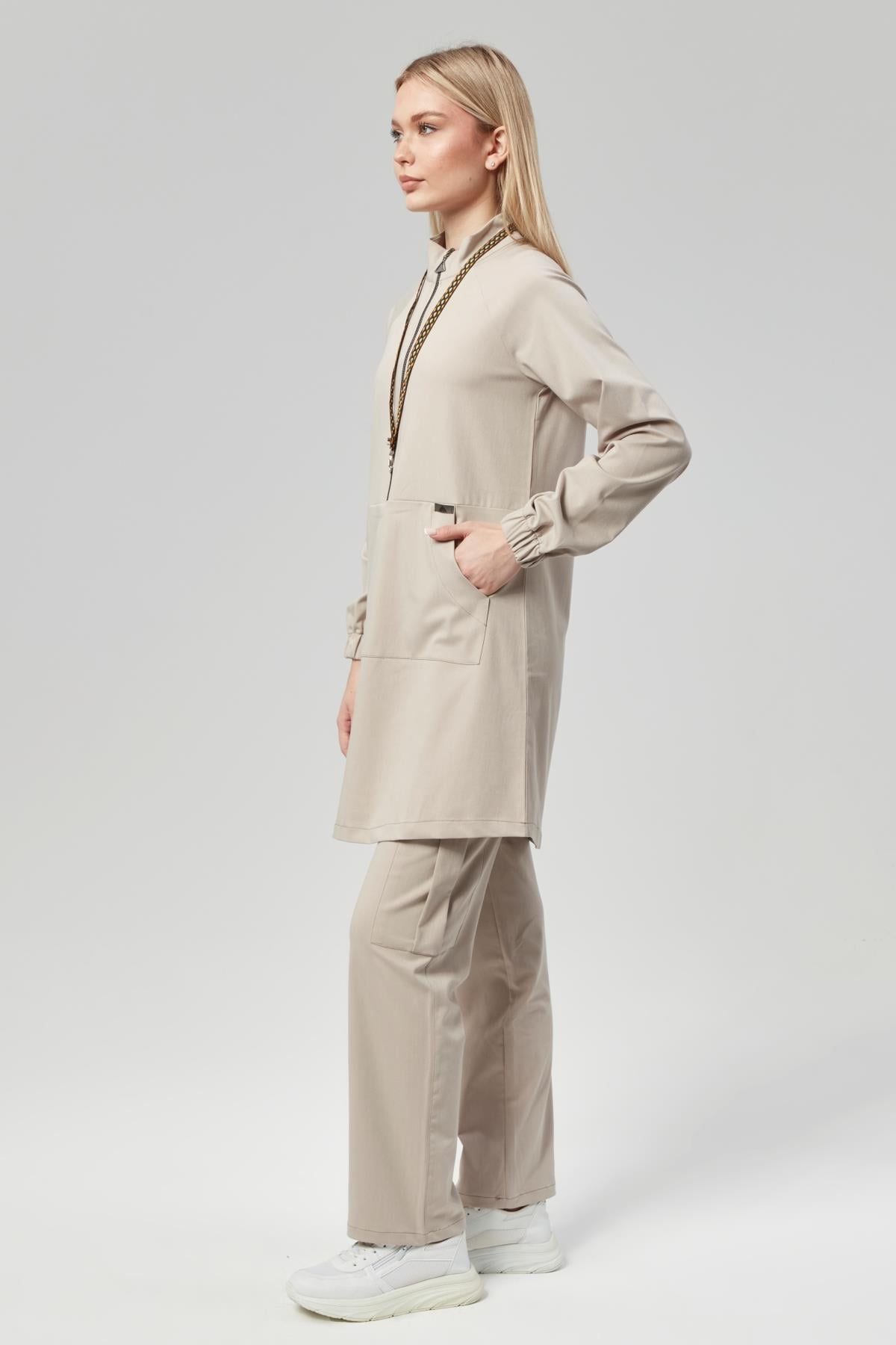 • Kargo cepli pantolonuyla ve kanguru cepli, reglan kollu, fermuar yakalı üst formasıyla dikkatler üzerinizde olacak.
