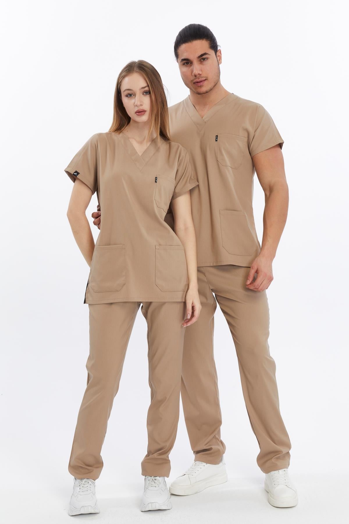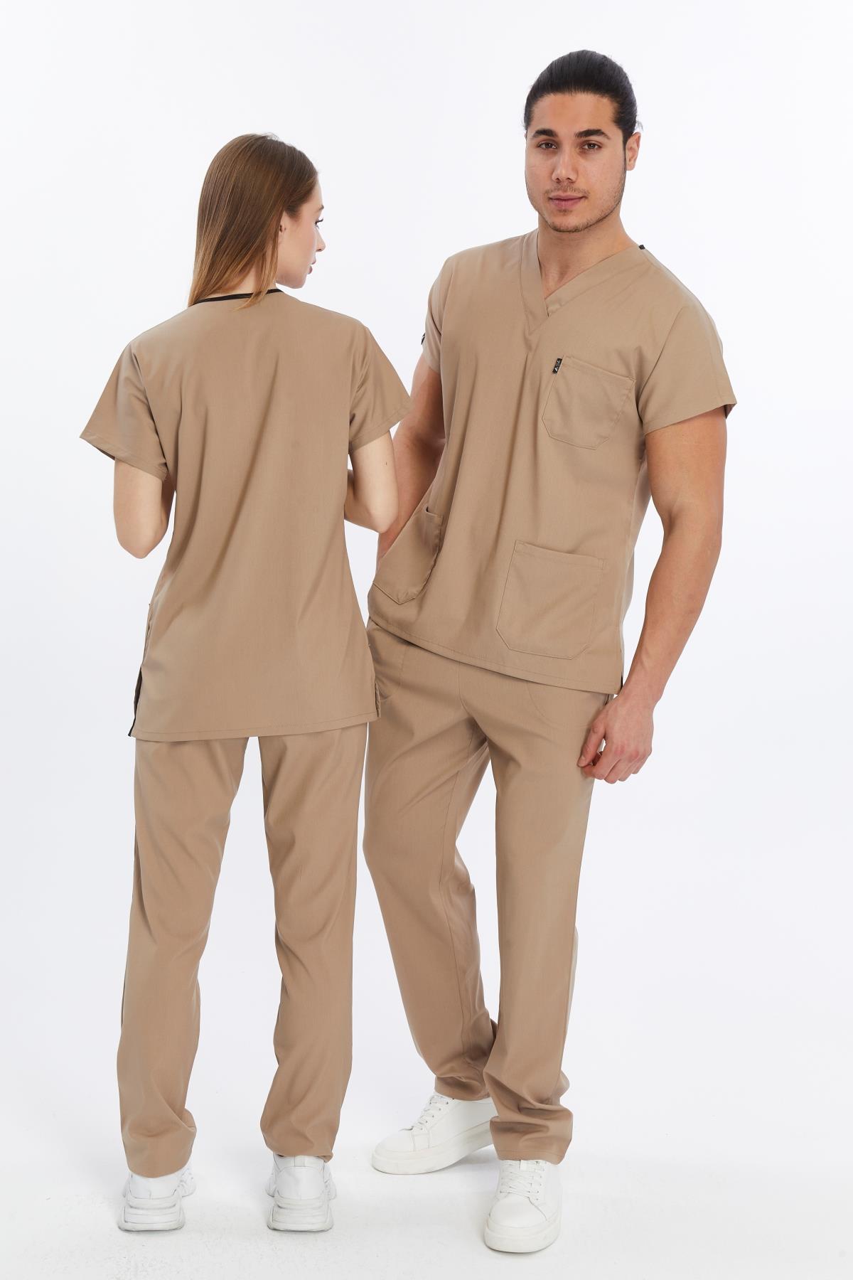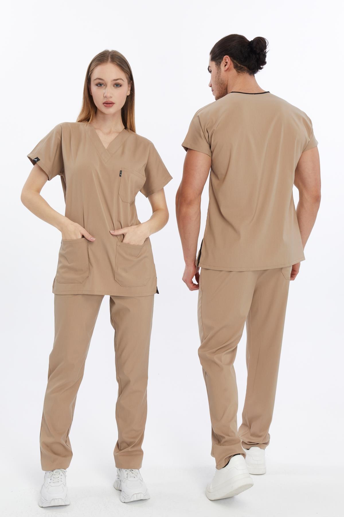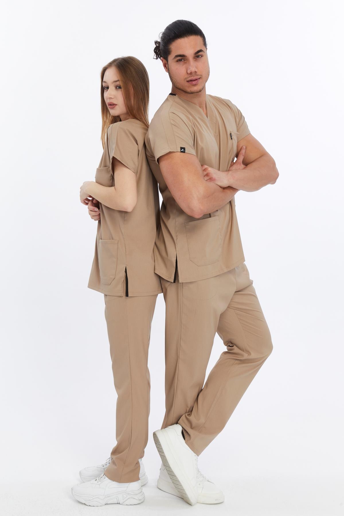 Happiness Basic - Likralı Doktor Hemşire Forma Takımı Scrubs Üniforma Cerrahi Takım (UNISEX), Bej (CATI15932)
