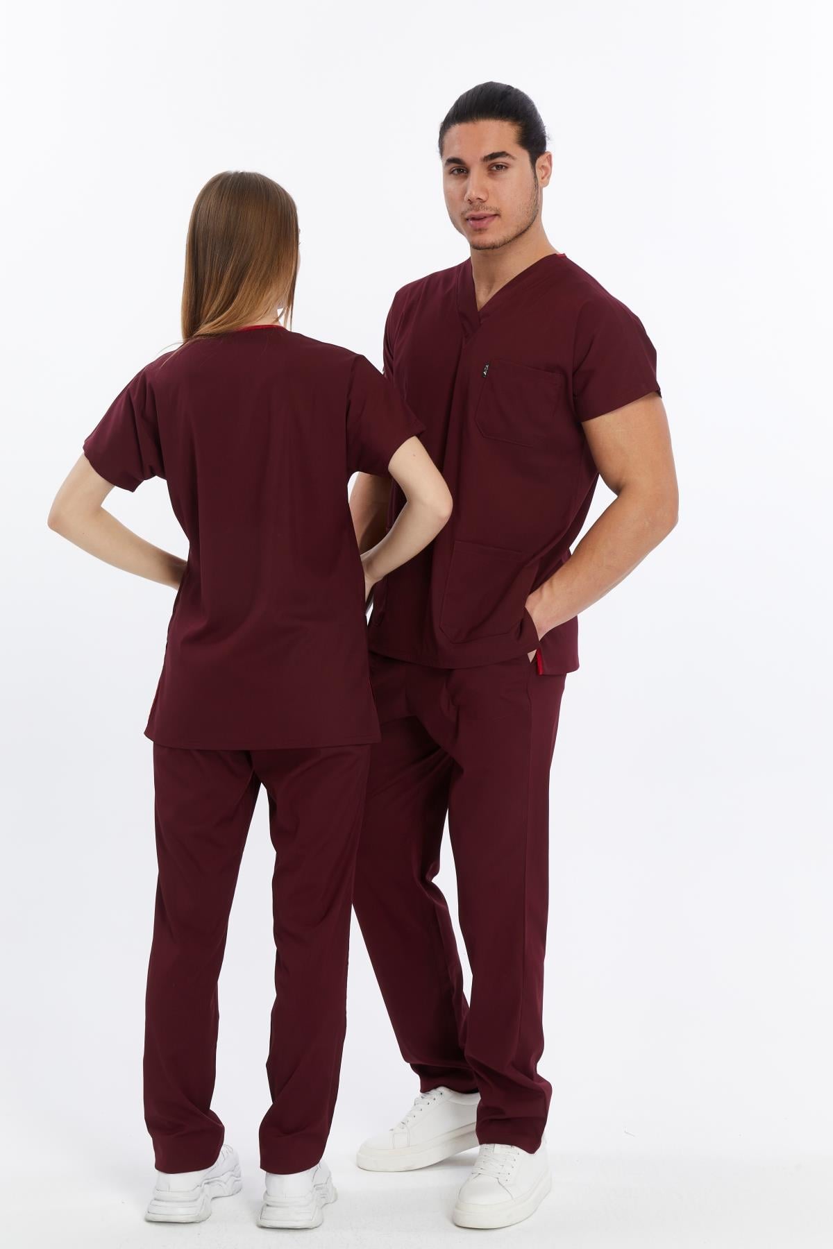 Happiness Basic - Likralı Doktor Hemşire Forma Takımı Scrubs Üniforma Cerrahi Takım (UNISEX), Bordo (CATI15908)