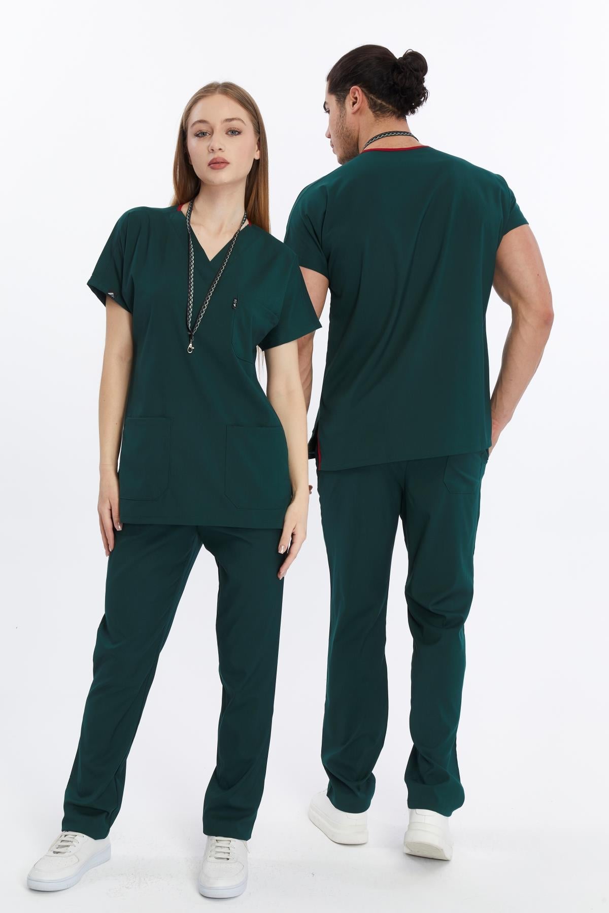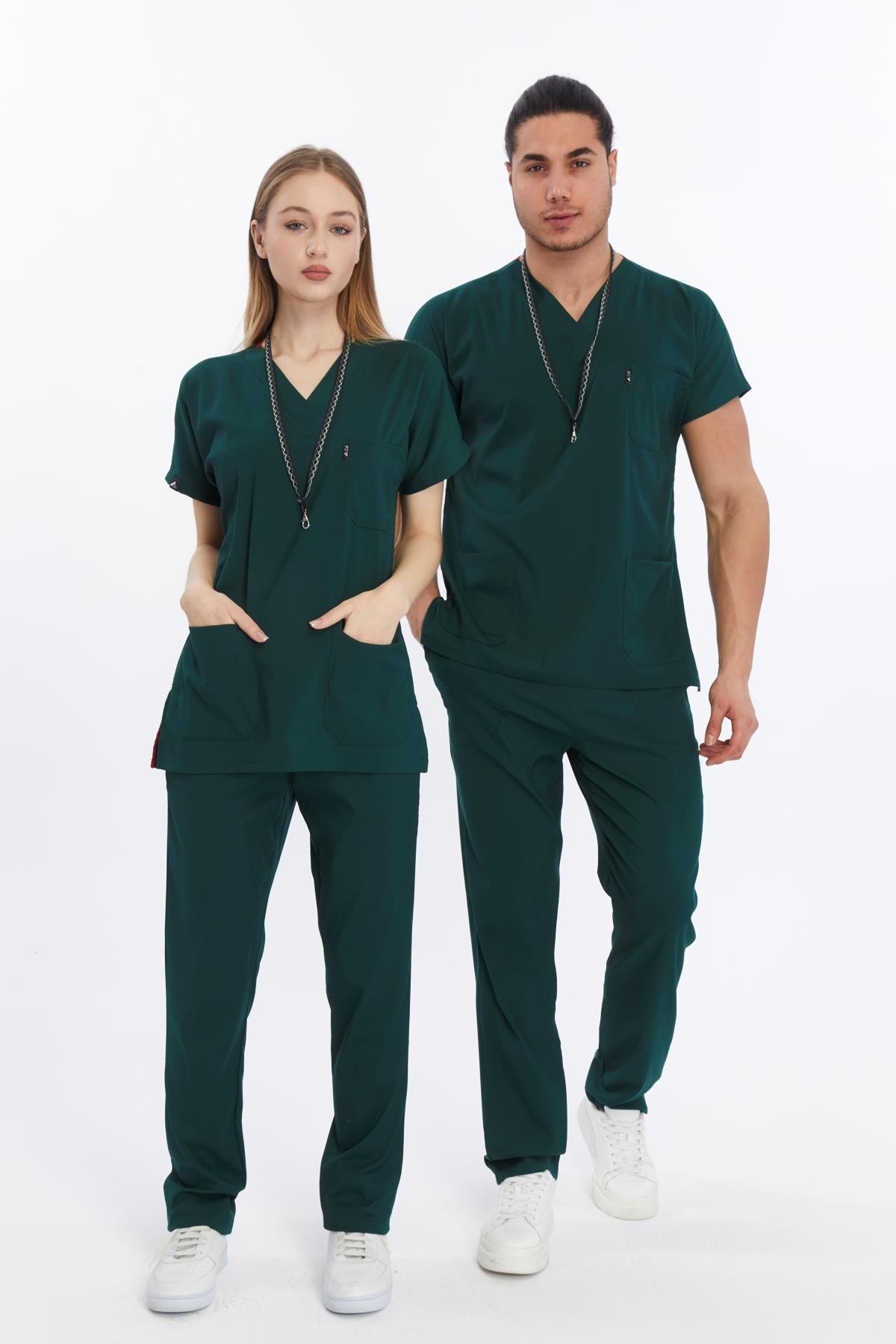 Happiness Basic - Likralı Doktor Hemşire Forma Takımı Scrubs Üniforma Cerrahi Takım (UNISEX), Koyu Yeşil (CATI15917)