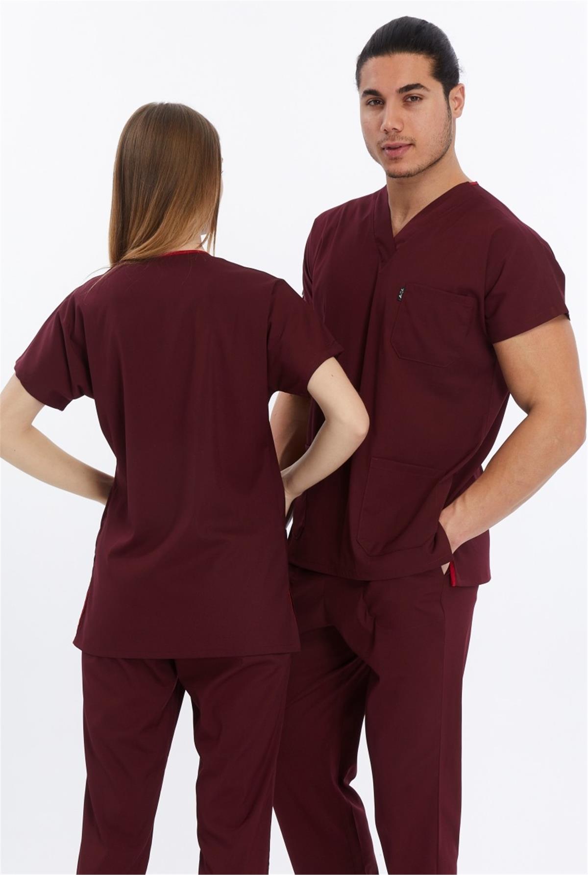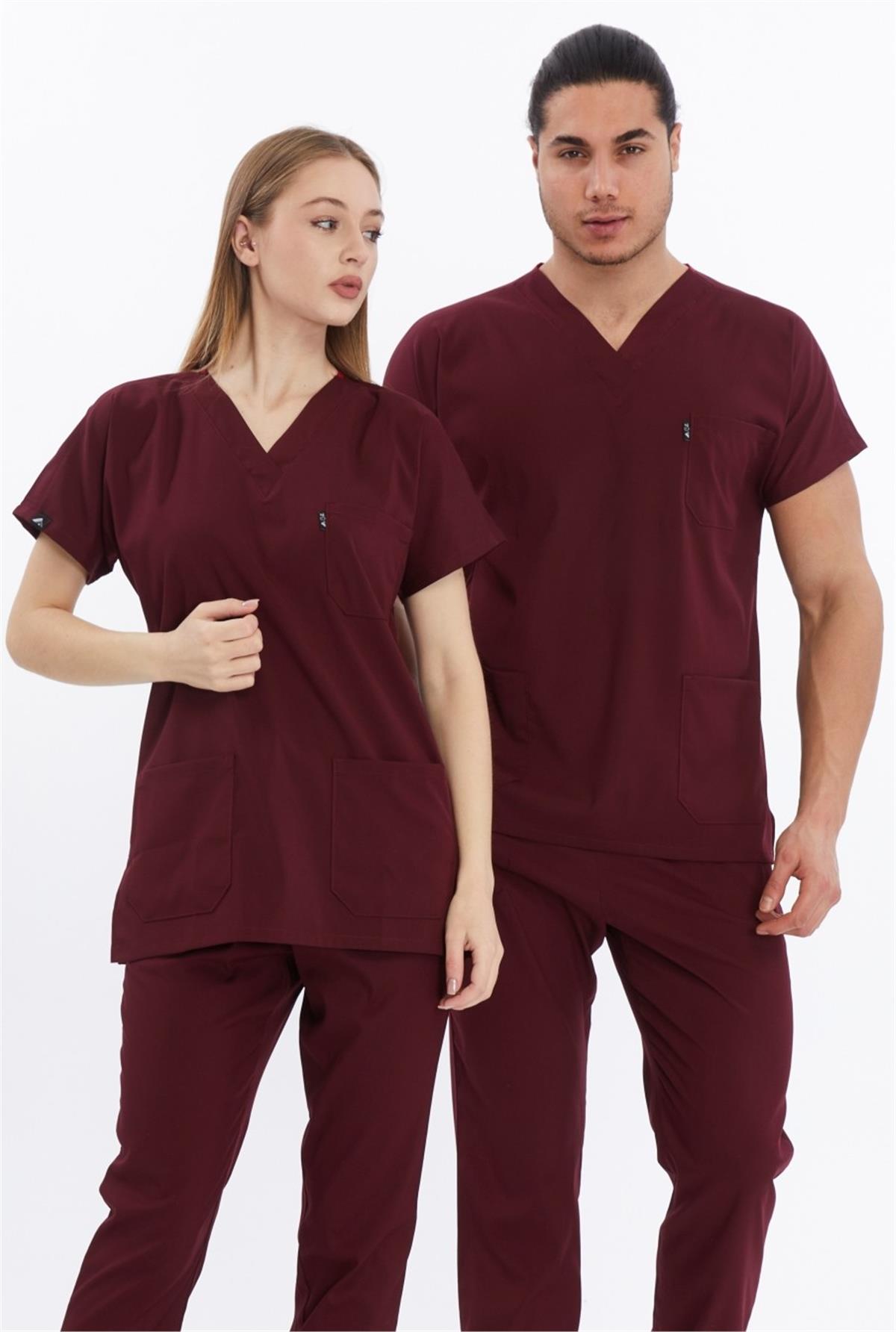 Happiness Basic - Likralı Doktor Hemşire Scrubs Tek Üst Cerrahi Forma (UNISEX), Bordo (CATI25908)