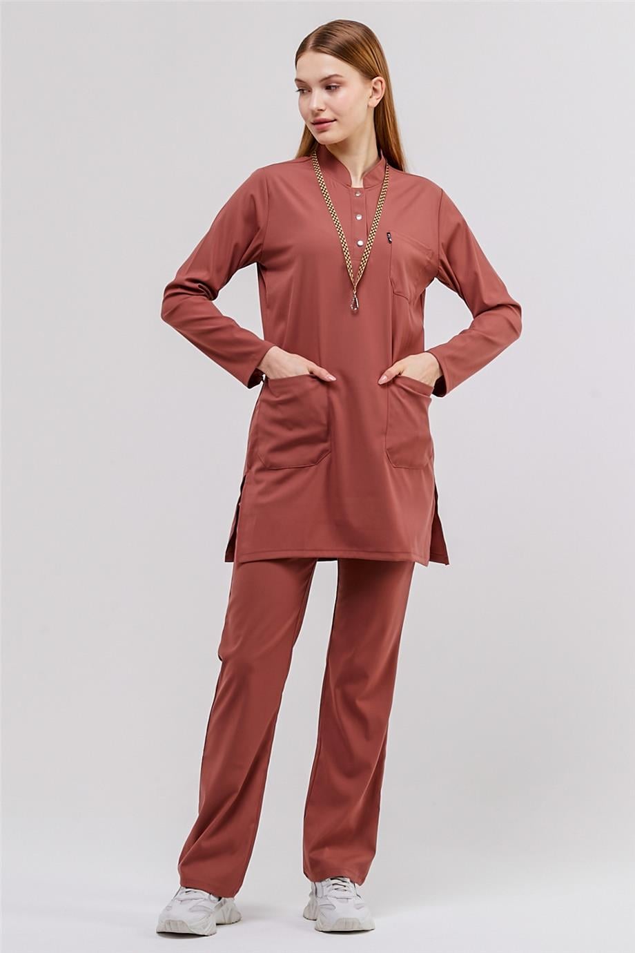 Happiness Modest - Likralı Doktor Hemşire Tesettür Forma Takımı Scrubs Üniforma Cerrahi Takım, Bisküvi (CATI12938)