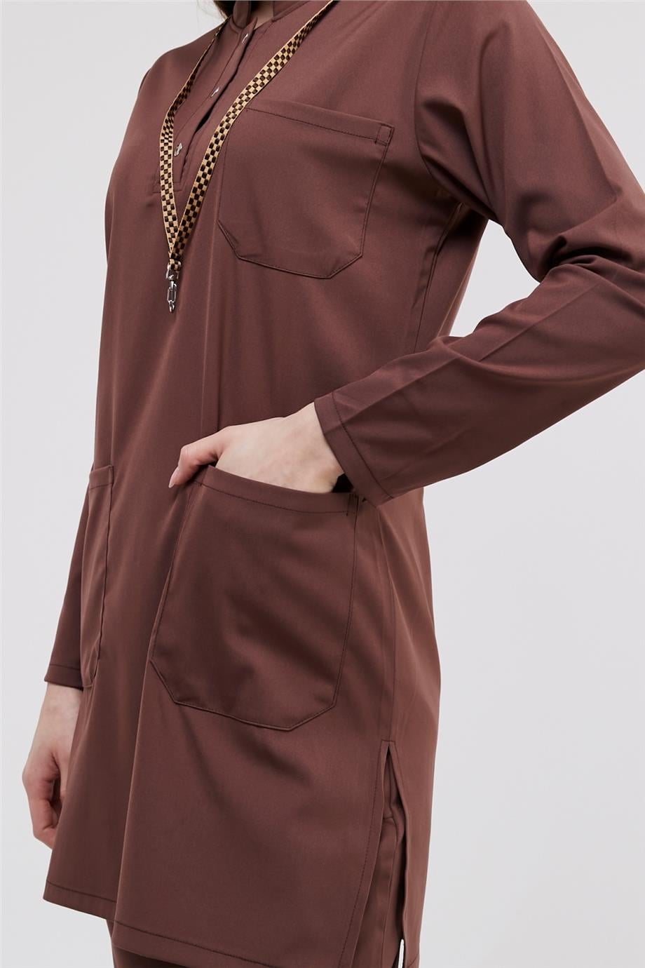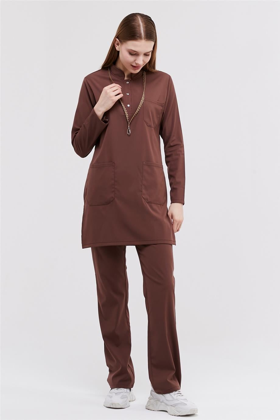 Happiness Modest - Likralı Doktor Hemşire Tesettür Forma Takımı Scrubs Üniforma Cerrahi Takım, Çikolata Kahve (CATI12937)