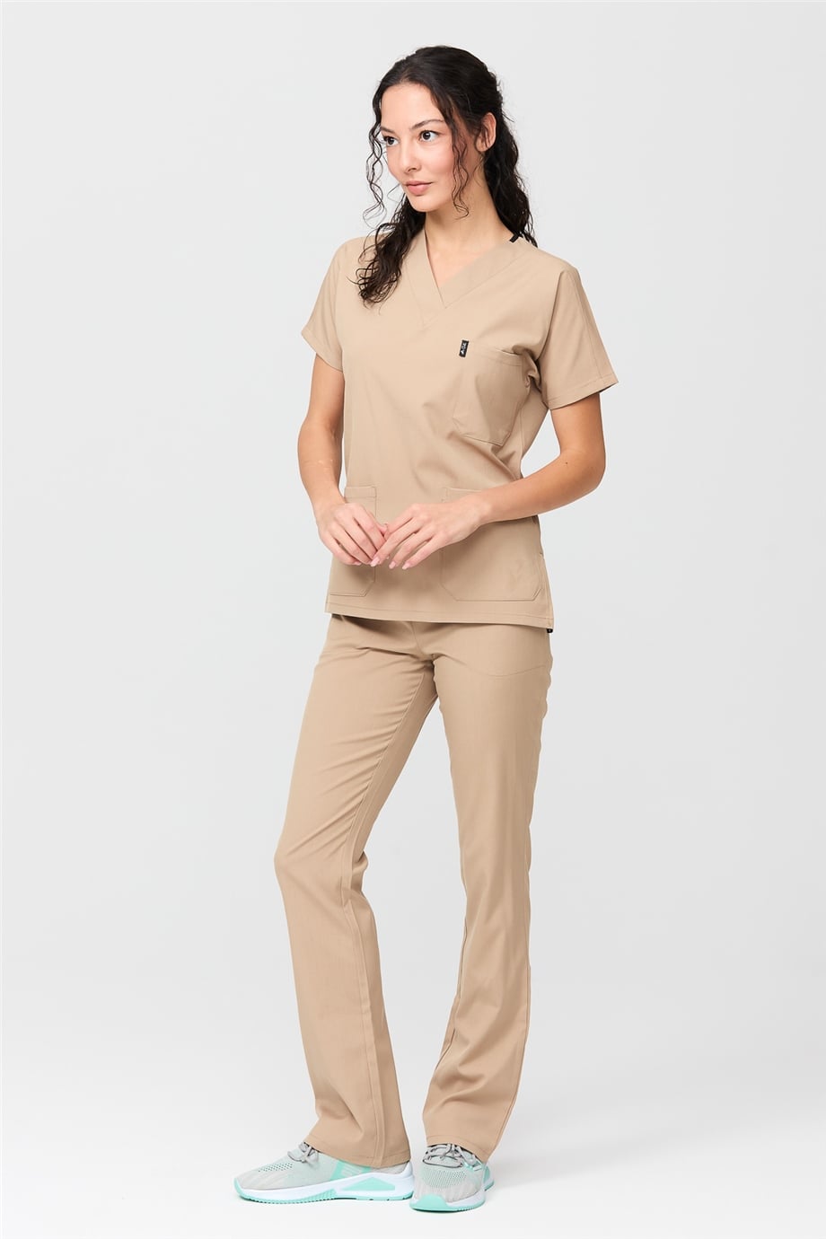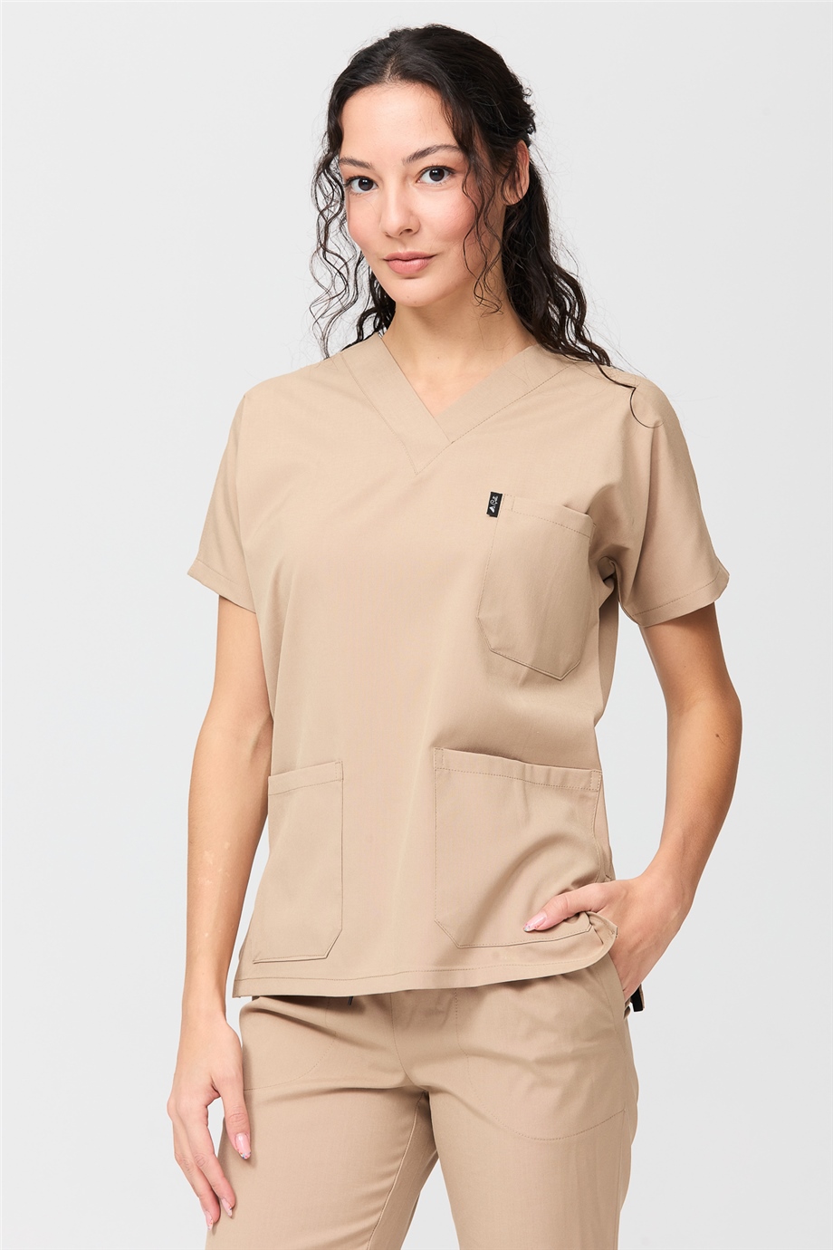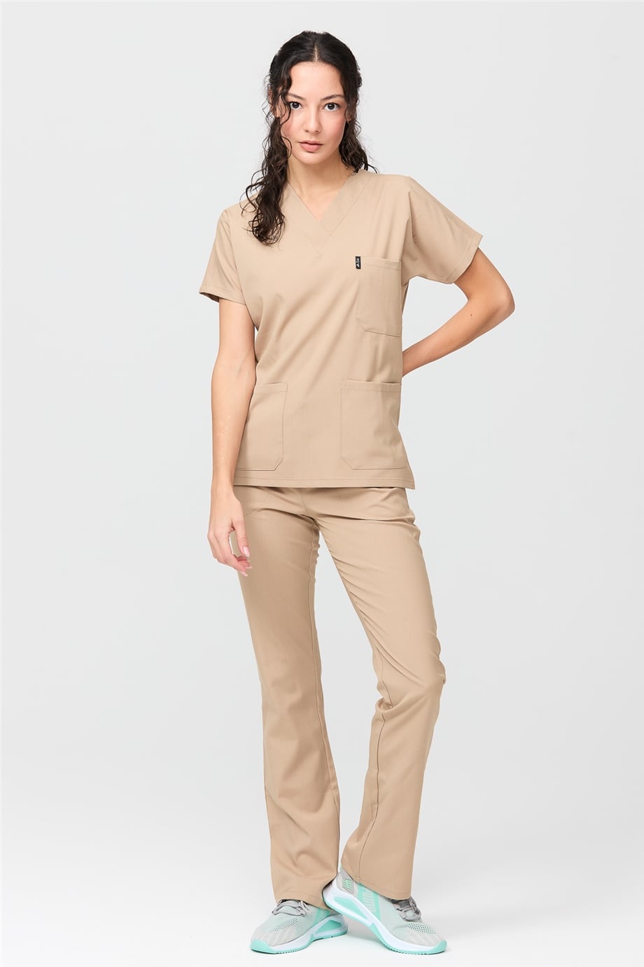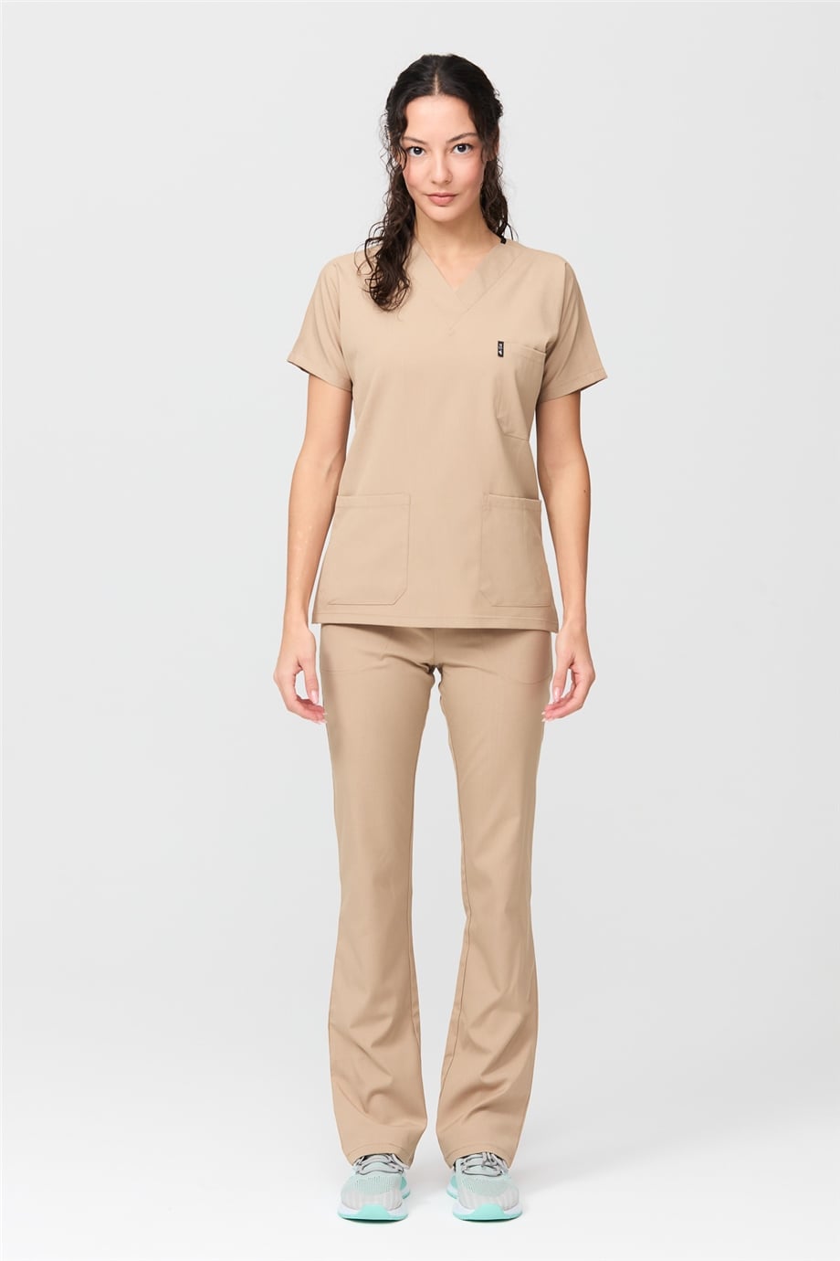 Happiness Spaniard - Likralı Doktor Hemşire Forma Takımı Scrubs Üniforma Cerrahi Takım (KADIN), Bej (CATI10932)