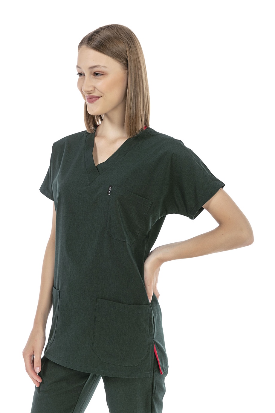 UltraLycra Basic - Likralı Doktor Hemşire Scrubs Tek Üst Cerrahi Forma (UNISEX), Koyu Yeşil (CATI25017)