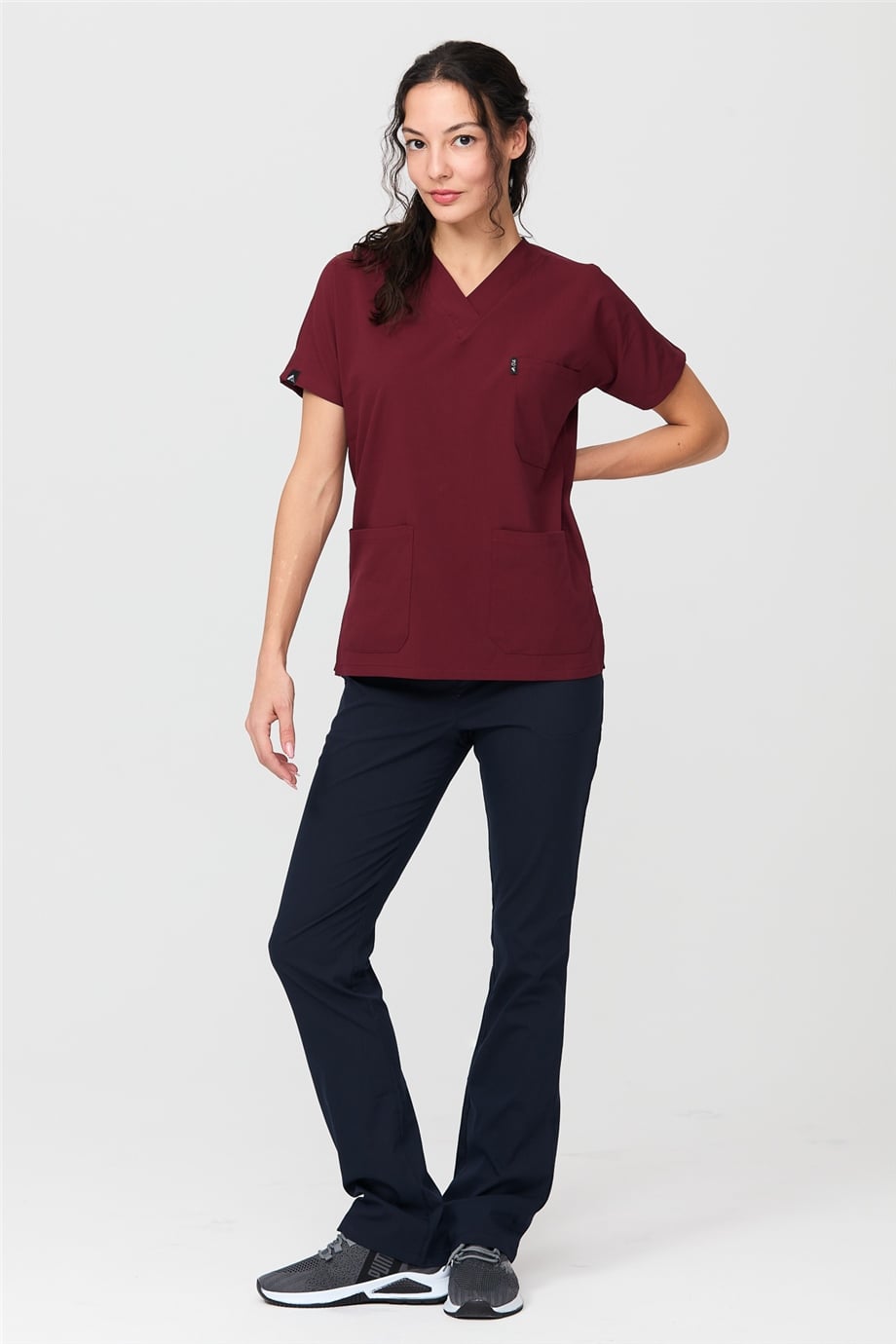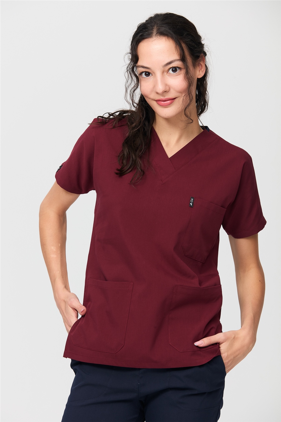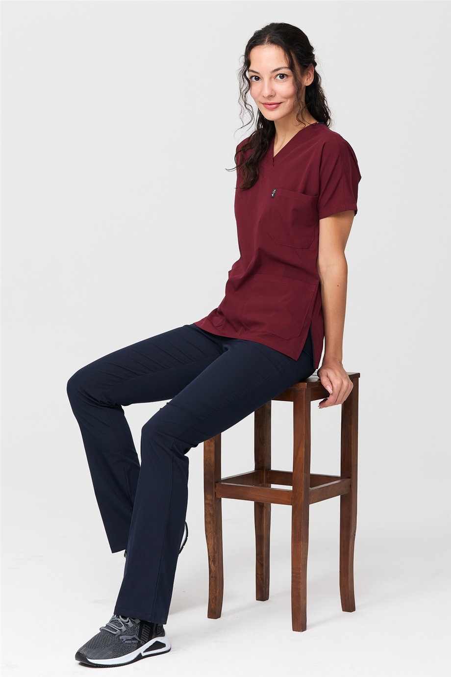 UltraLycra Harmony/Spaniard - Likralı Doktor Hemşire Forma Takımı Scrubs Üniforma Cerrahi Takım (KADIN), Bordo/Laci (CATI1060803)