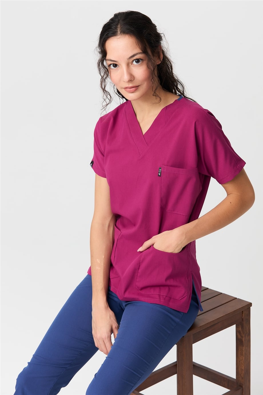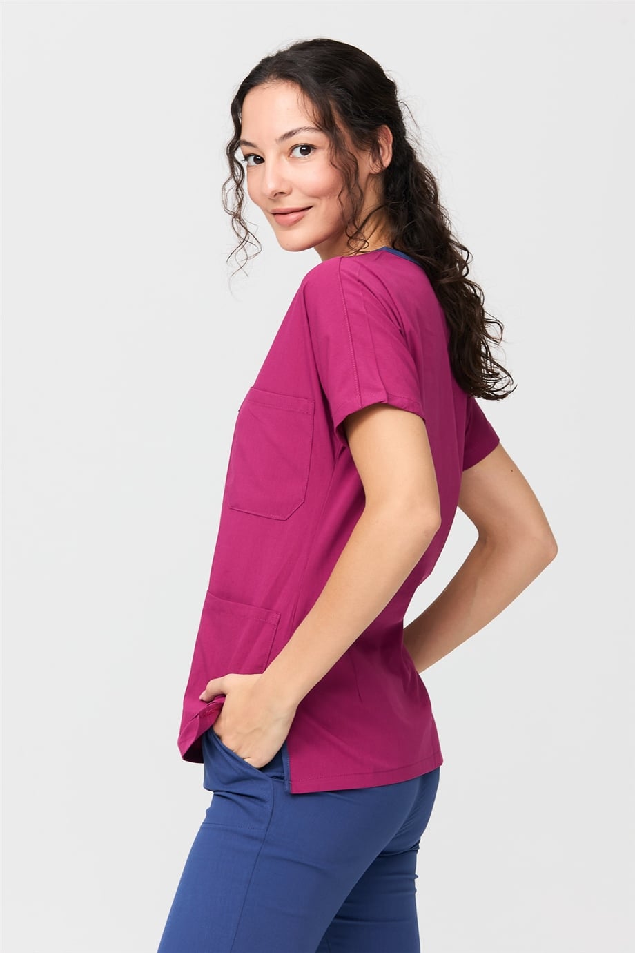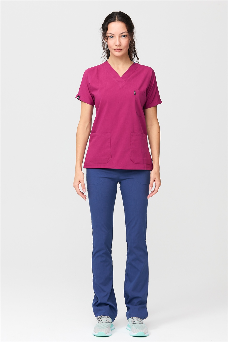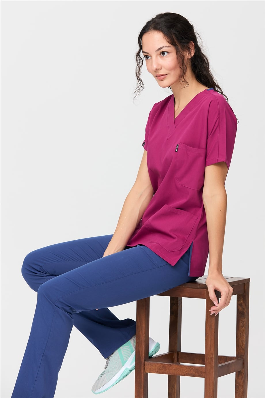UltraLycra Harmony/Spaniard - Likralı Doktor Hemşire Forma Takımı Scrubs Üniforma Cerrahi Takım (KADIN), Vişne/Fırtına Mavi (CATI1061820)