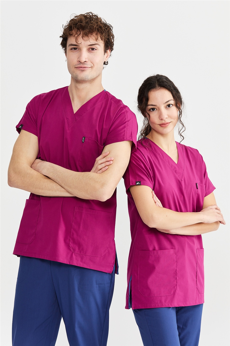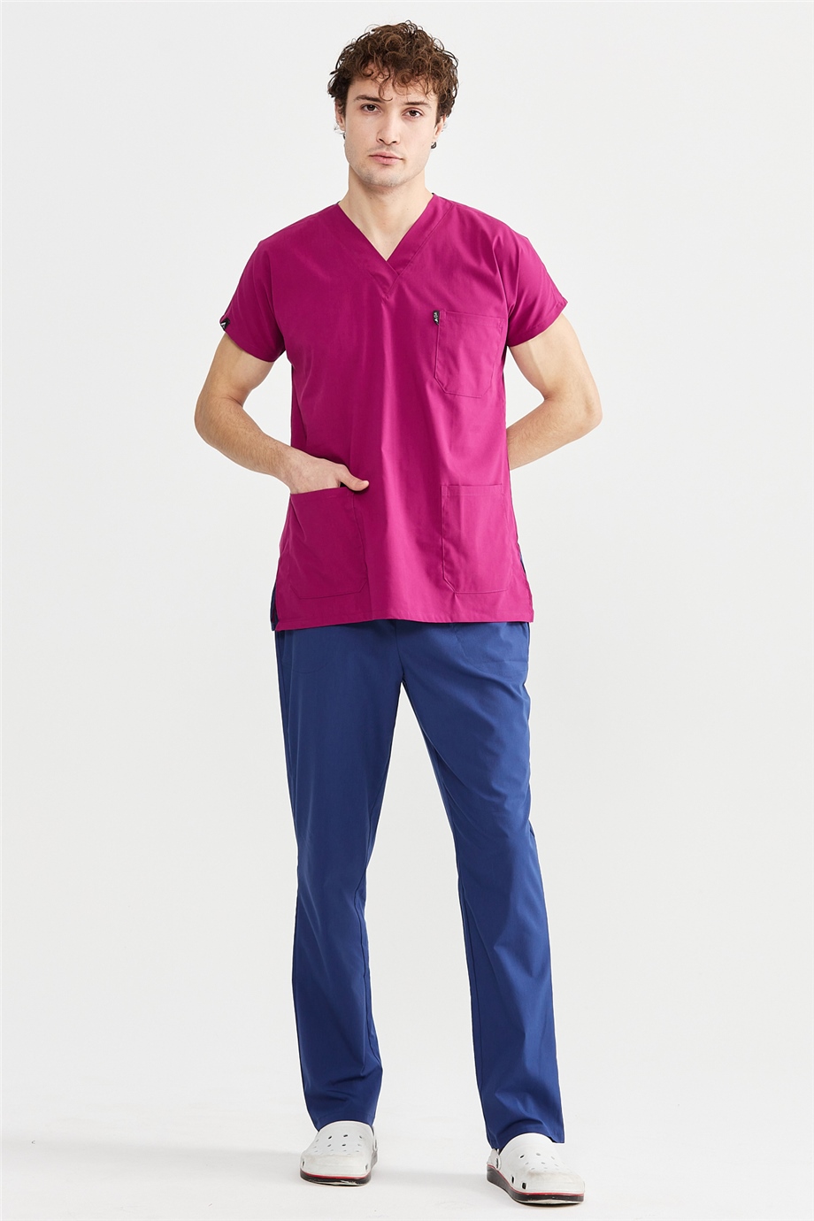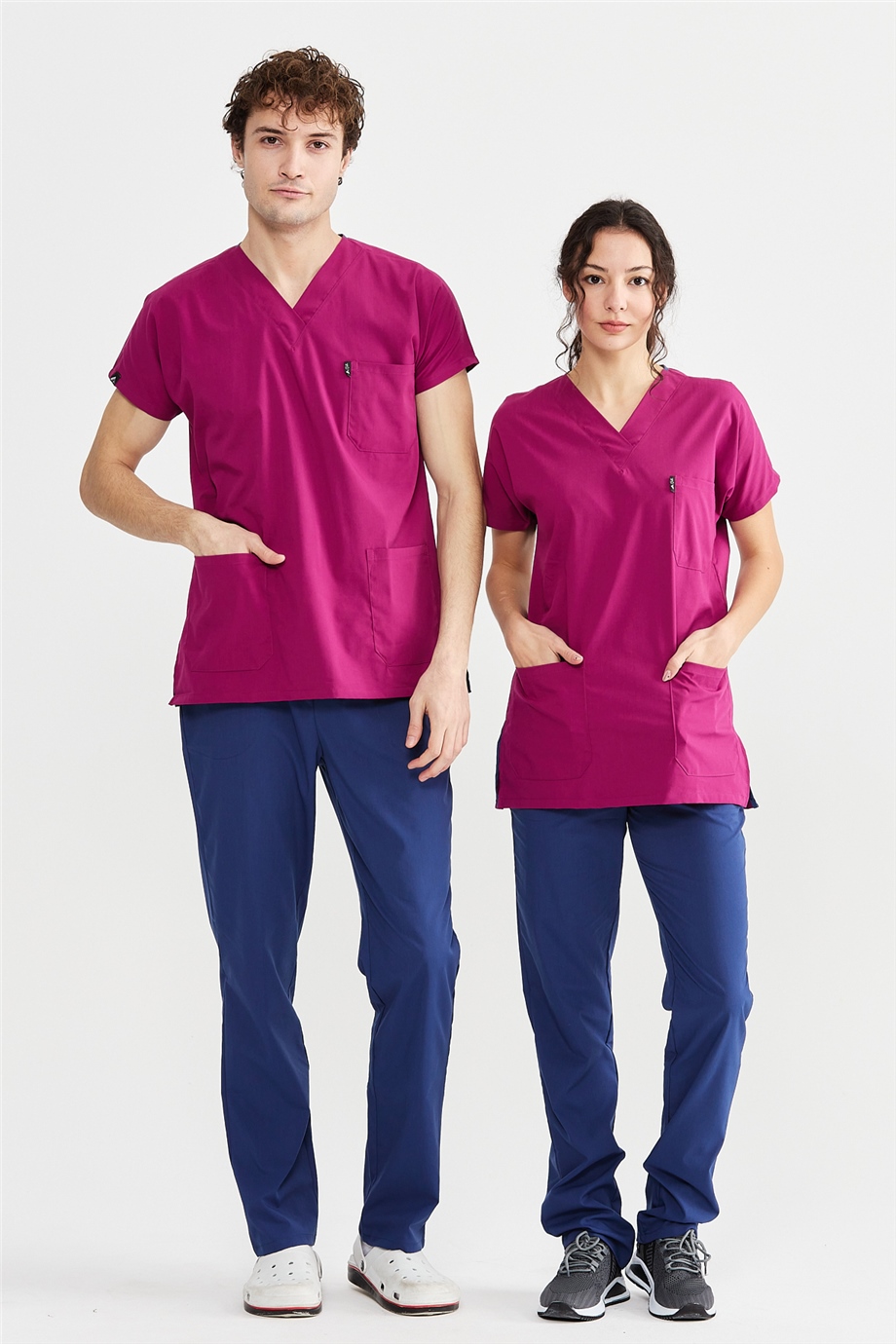 UltraLycra Harmony/Basic - Likralı Doktor Hemşire Forma Takımı Scrubs Üniforma Cerrahi Takım (UNISEX), Vişne/Fırtına Mavi (CATI1501820)