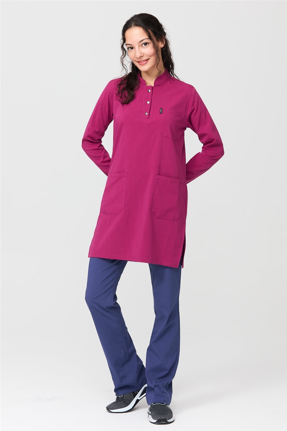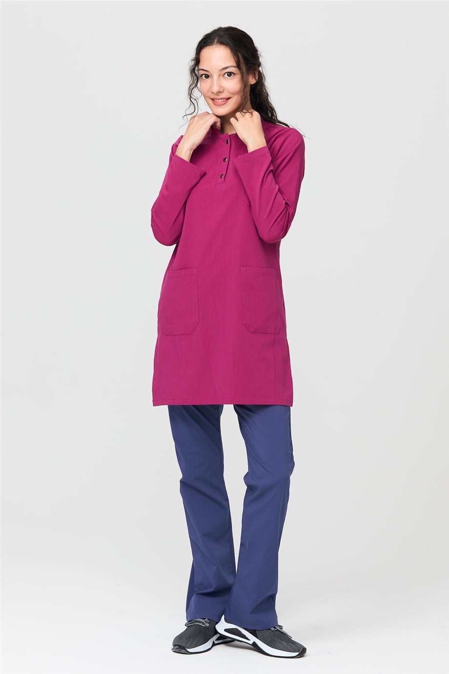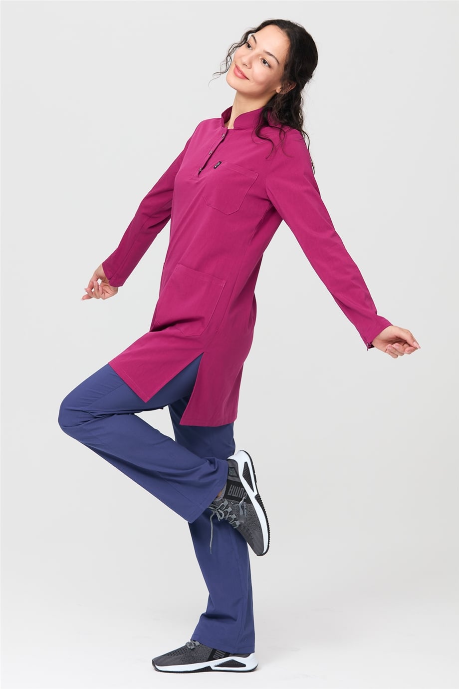 UltraLycra Harmony/Modest - Likralı Doktor Hemşire Tesettür Forma Takımı Scrubs Üniforma Cerrahi Takım, Vişne/Fırtına Mavi (CATI1201820)