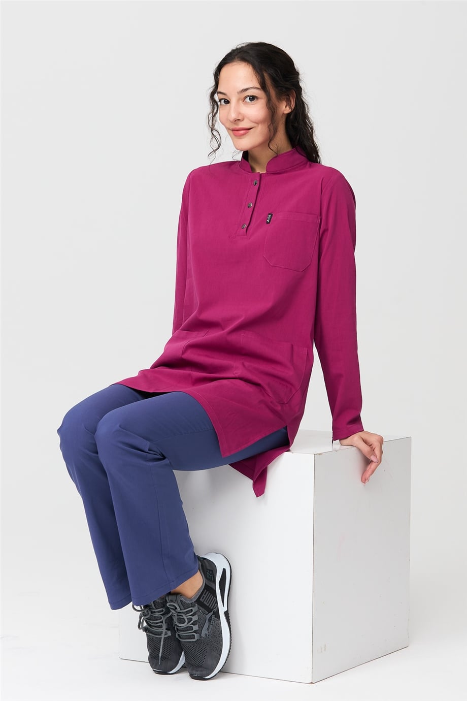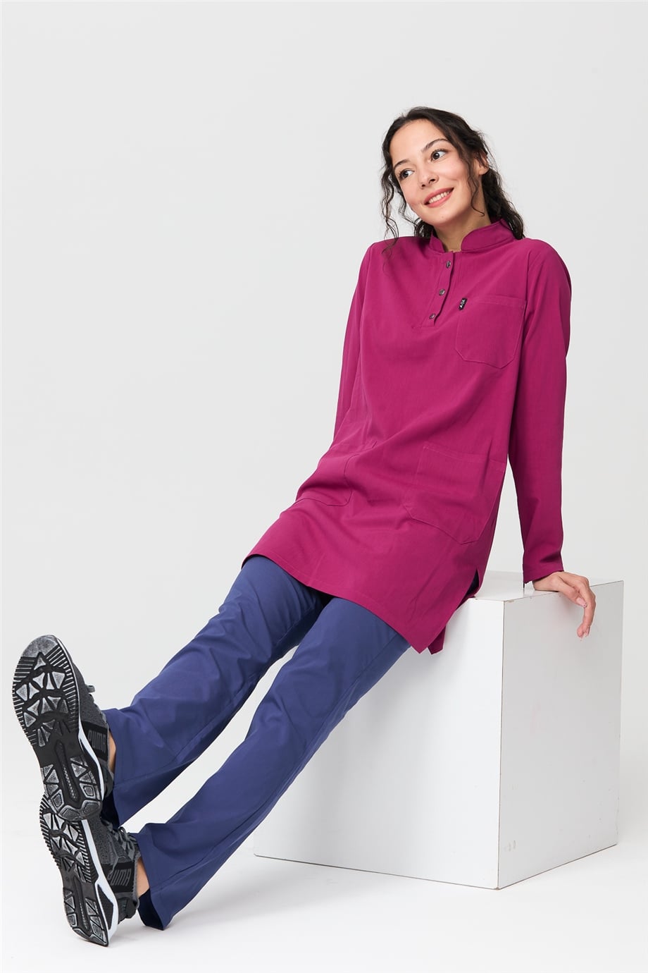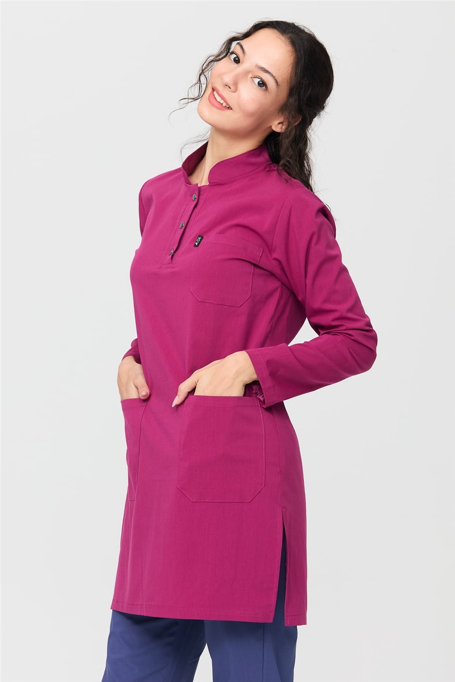 UltraLycra Harmony/Modest - Likralı Doktor Hemşire Tesettür Forma Takımı Scrubs Üniforma Cerrahi Takım, Vişne/Fırtına Mavi (CATI1201820)