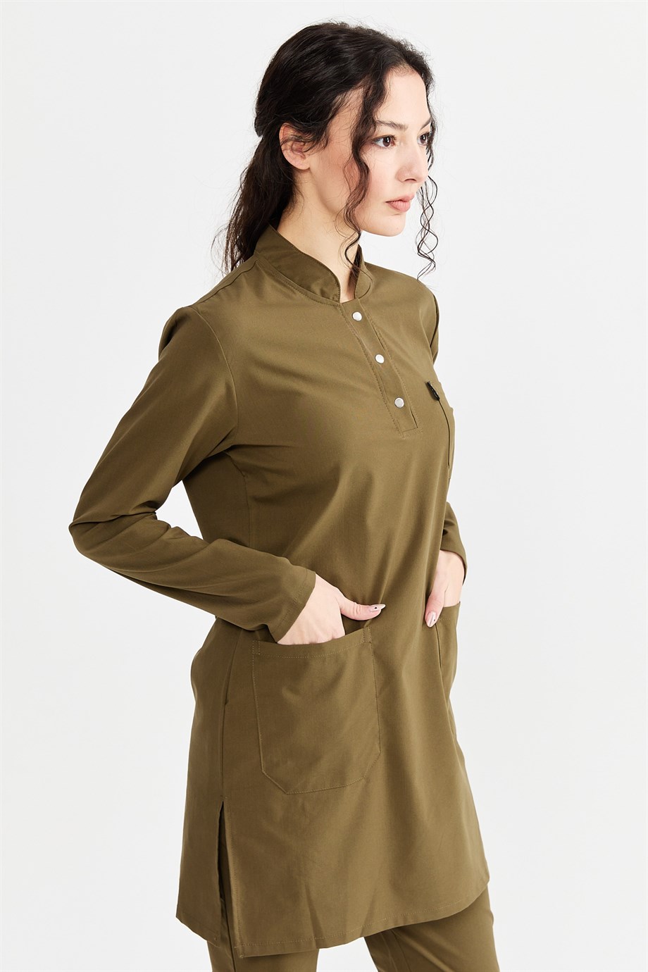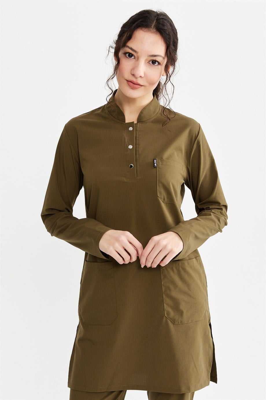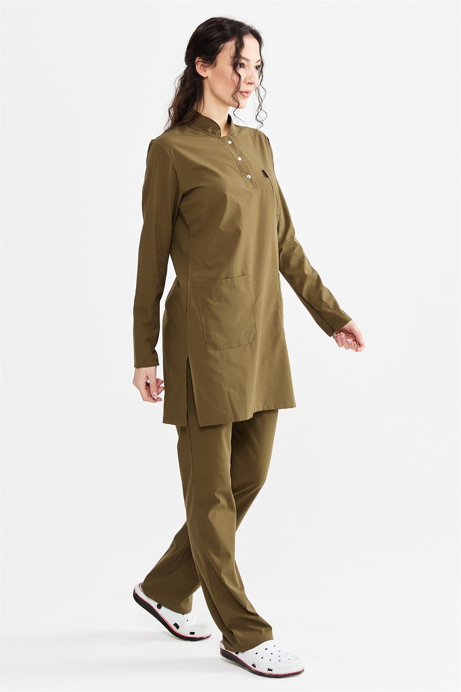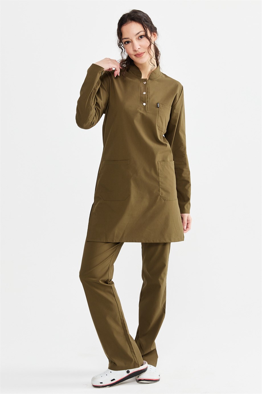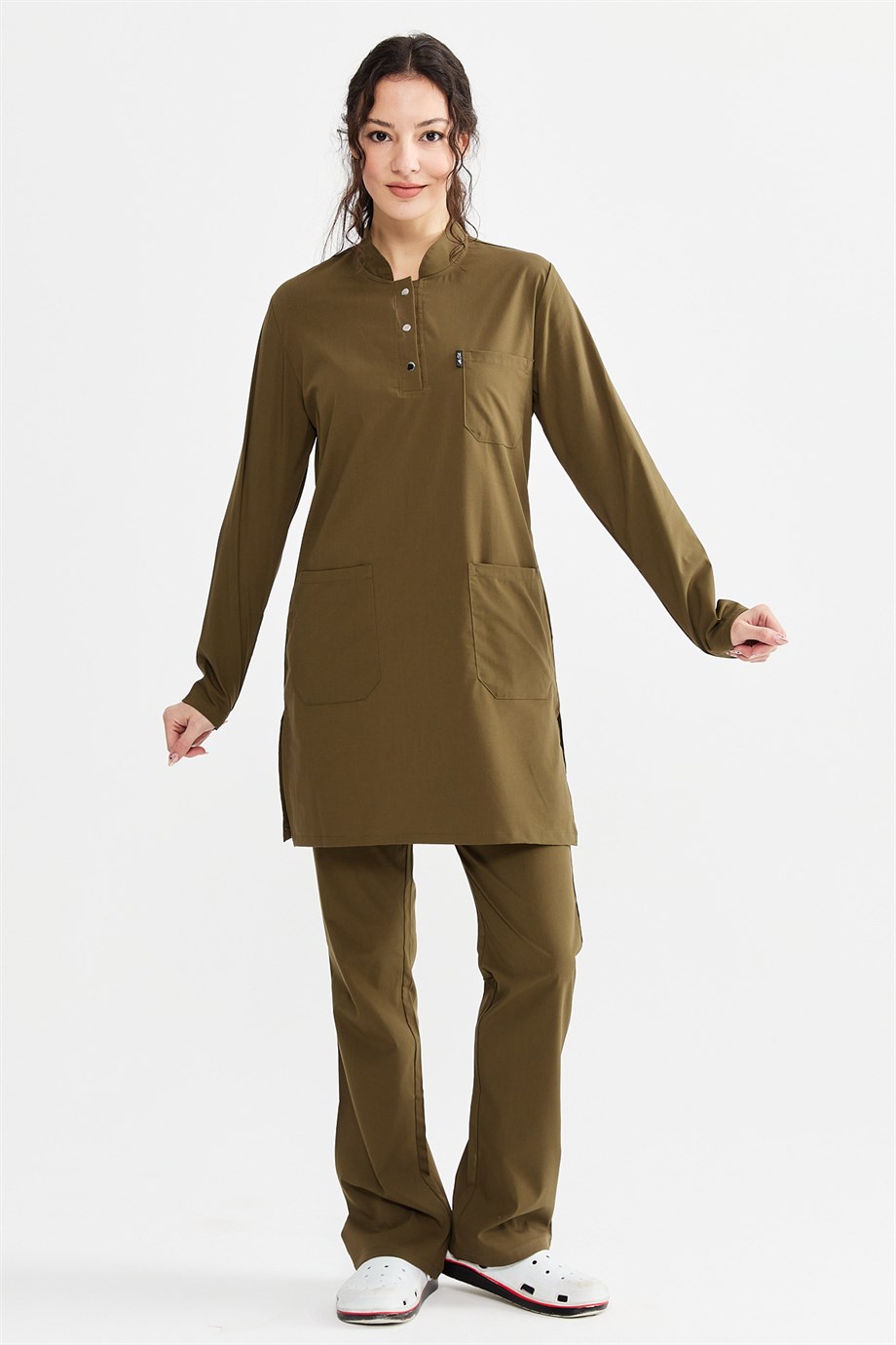UltraLycra Modest - Likralı Doktor Hemşire Tesettür Forma Takımı Scrubs Üniforma Cerrahi Takım, Haki (CATI12016)
