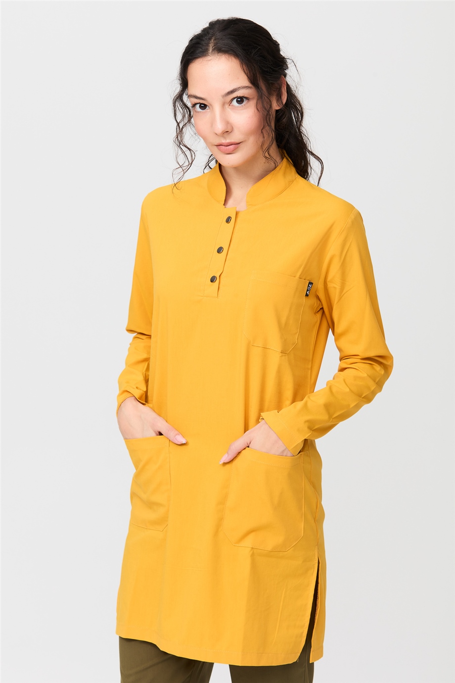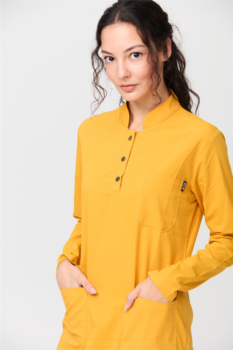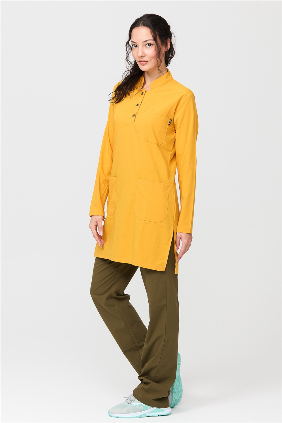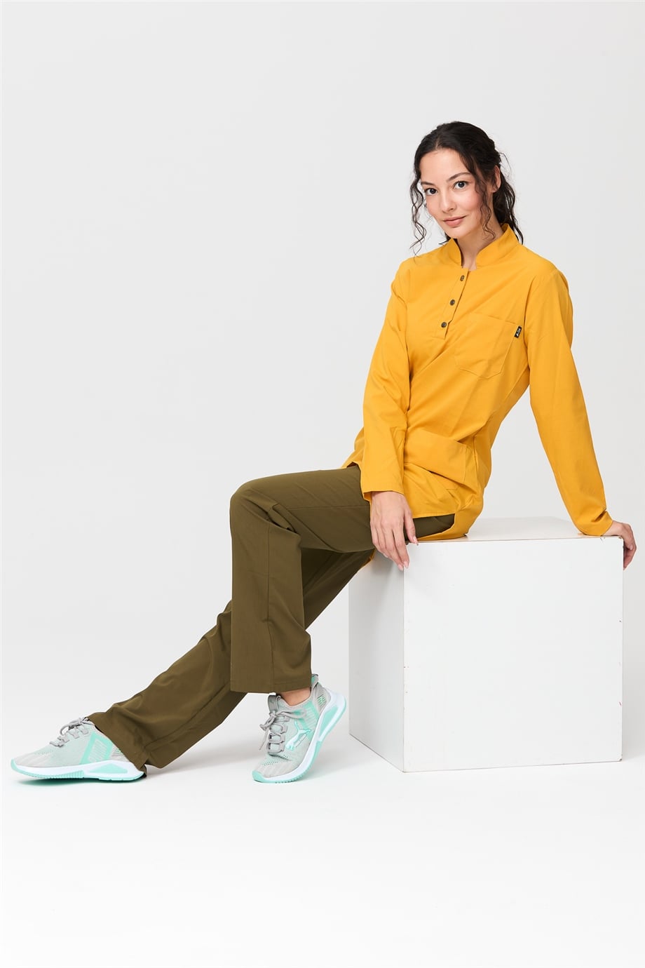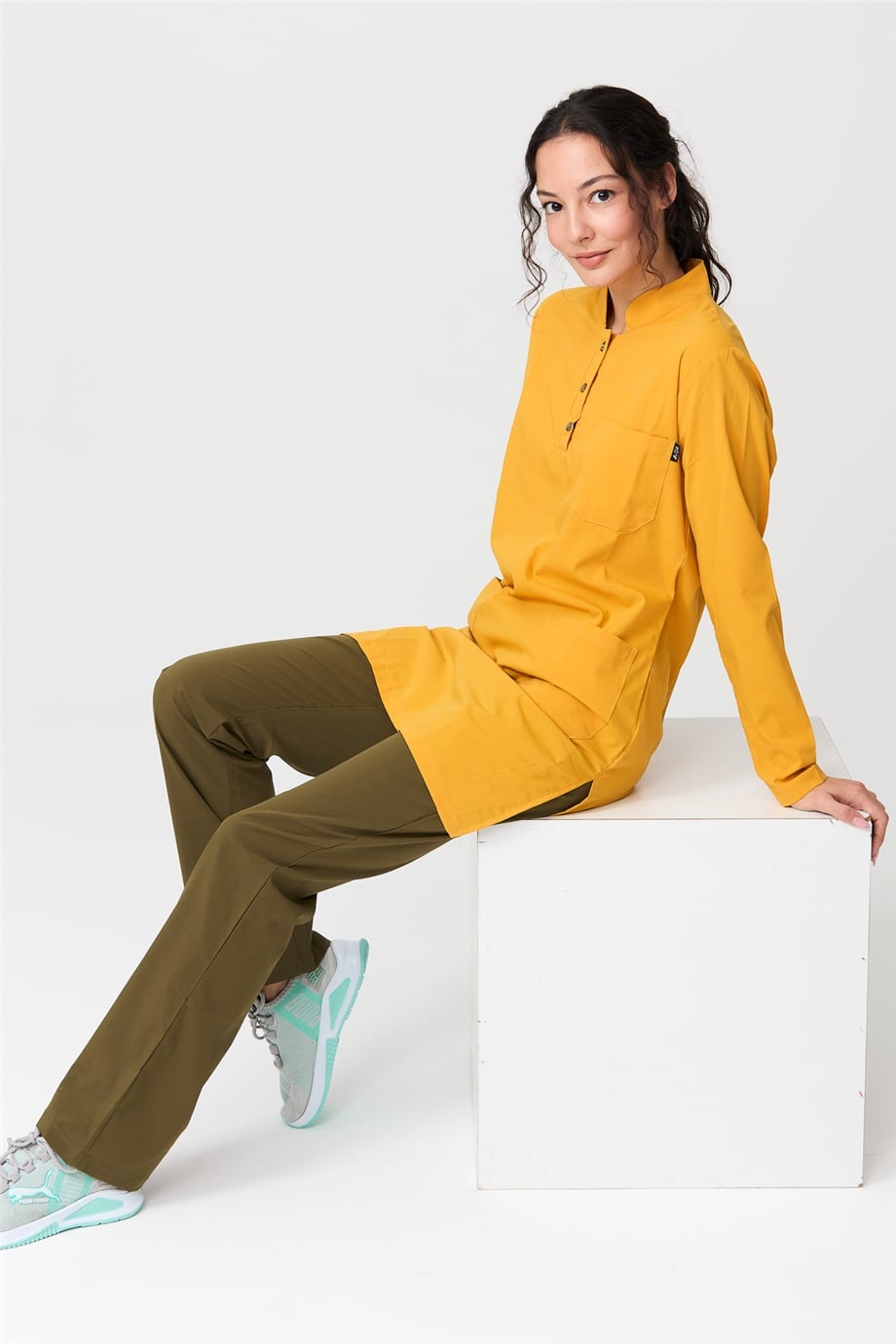 UltraLycra Harmony/Modest - Likralı Doktor Hemşire Tesettür Forma Takımı Scrubs Üniforma Cerrahi Takım, Safran/Haki (CATI1201916)